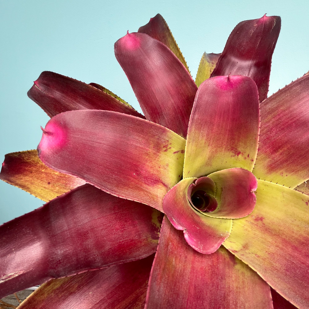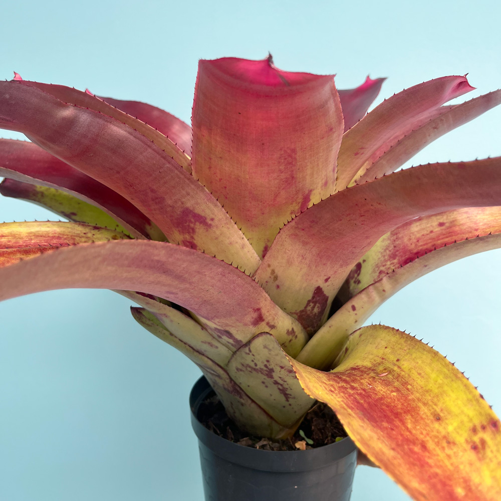 Sus hojas largas, firmes y con bordes finamente espinosos forman una roseta imponente que, durante la floración, tiñe su centro de rojo intenso. Resistente y de crecimiento robusto, esta bromelia es ideal para jardines tropicales, terrazas soleadas o proyectos de paisajismo, aunque también se adapta a interiores luminosos protegidos del sol directo intenso.