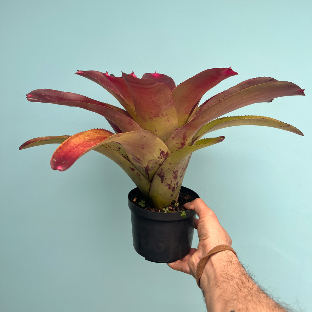 Este ejemplar de Neoregelia johannis (50 cm de diámetro) ha sido cultivado a pleno sol, desarrollando un follaje espectacular que combina tonos rojizos, verdes y dorados. Es una especie tropical de gran potencial ornamental, capaz de crecer hasta más de 1 m en condiciones óptimas.